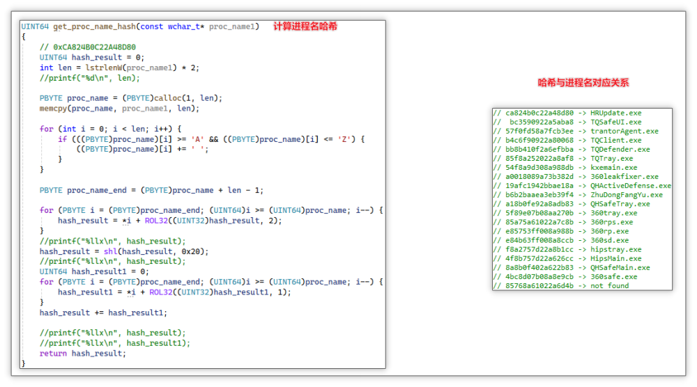 样本会遍历进程,将进程名利用循环左移和求和的方式进行计算,最后与哈希值进行比对,判断出需要拦截的进程名。